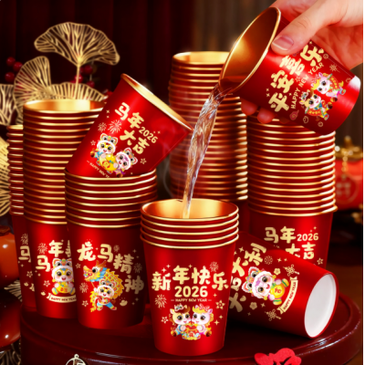 2026马年新款春节纸杯加厚一次性新年过年福字金箔杯子家用批发